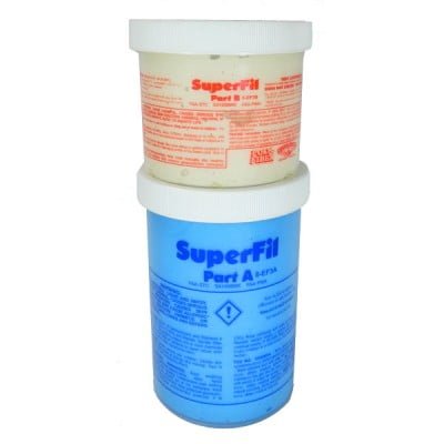 Superfil is an ultra-lightweight epoxy filler for rough fill and contouring. Comes in two containers. Mix, apply with a squeegee, and let dry overnight. More consistent than hand-mixed micros. Weighs only 3.8 lbs. per gallon.