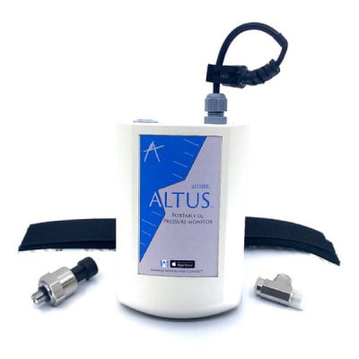 The first portable oxygen tank monitor that wirelessly pairs to your iOS device for pressure, flow rate, and time-remaining monitoring. Features Siri voice notifications via a paired headset when pressure drops below 500 psi or when threshold altitudes are crossed. The Altus removable straps to your oxygen tank and includes a high pressure T-fitting so you can keep your manual pressure gauge for backup.