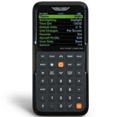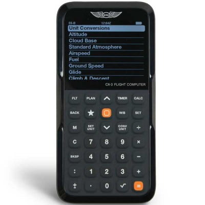 The CX-3 Flight Computer provides a fast, accurate flight computing solution and takes confusion out of the equation for ground school study, preflight planning, and enroute navigation. Fast, versatile and easy to use, the CX-3 delivers accurate results quickly and efficiently through an intuitive menu structure designed to follow typical flight planning sequences with a minimum of keystrokes. It can be used on all FAA and Canadian pilot, mechanic, and dispatcher knowledge exams. A multitude of aviation functions can be performed on the CX-3 flight computer including those related to time, speed, distance, heading, wind, fuel, altitude, cloud base, standard atmosphere, glide, climb & descent, weight & balance, as well as a holding pattern function to help determine entry method and holding details. A calculator, clock, timer and stopwatch are also built in along with multiple settings for lighting, backlighting, themes, scrolling speed, time zones and more. The sleek design, and ergonomic fit and finish of the CX-3 make for easy transport. The removable cover provides protection for the computer when it’s not in use and serves as a base for the unit when attached to the back. A no-slip-strip prevents the CX-3 from sliding around on smooth desk surfaces. A Theme feature provides a convenient way to switch from Standard view to Night or Daylight views. The backlighting feature controls the brightness or intensity of the screen, and the buttons on the keypad will light up in Dusk and Night modes for use in darker environments. A Favorite feature provides quick access to your most frequently used function, and aircraft profile memory to save weight and balance information for your specific aircraft. |