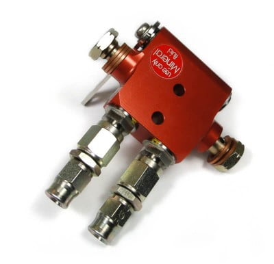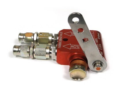 | Lightweight parking brake valve, aluminum anodized, fully CNC machined, for dual brake installations. Available for mineral-based fluid type MIL-H-5606 or DOT4 brake fluid.