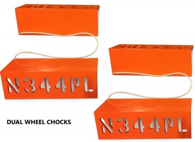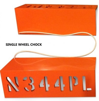 This product is unique compared to some of the other wheel chocks out there. These custom wheel chocks are lightweight aluminum for large corporate jets. These wheel chocks are carefully fabricated, engraved and then covered with durable powder coating available in grey, black, or orange.