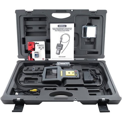 The handheld DCS1600 Video Borescope System features a bright, 3.5in. (89mm) extra-wide TFT (Thin Film Transistor) color monitor for real-time viewing, with a 3.3ft. (1m) camera probe that retains its configured shape for inspecting hard-to-reach areas. This compact, palm-sized unit, with its revolutionary mobility and innovative technology, allows use in automotive maintenance, electrical repair, plumbing applications, and for visually inspecting otherwise inaccessible areas without the need for large multiple components. |