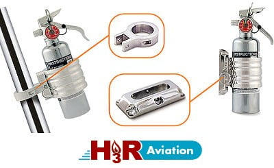 H3R Performance hand held 1 lb. and 2.5 lb. fire extinguishers come standard with aviation style mounting brackets. Stylish and versatile billet mounting accessories are also available. Band clamps fit 2.6” or 3.0” diameter fire extinguishers, and can be combined with the flat surface mount or either of the two roll bar mounts.