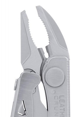 | Locking pliers that fold away make the Leatherman Crunch unlike any multi-tool available today. The Crunch clamps up to a 1-inch diameter pipe, and if you remove the adjusting screw, you’ll find a hex-bit adapter built right in. With locking blades that release with the push of a button, the Crunch will take a bite out of any job. |