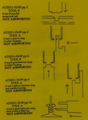 | The No-Go gage requires inspection of rollers; roller housings, seat rails, engagement pin, and attaching hardware. There are five measurements required for each pilot and co-pilot seat, these two tools will shorten the time to make these five measurements to minutes. |