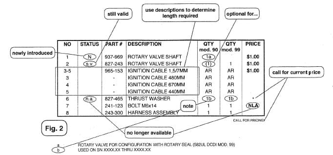 Explanations of symbols and statements in part number charts: