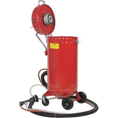 This portable 28-gallon vacuum unit blasts, removes and recycles abrasives in one operation. It works with glass beads, aluminum oxide, steel grit, garnet, plastic grit, walnut shells, corn cobs and more. Rolls easily on 6-inch wheels. What’s included: