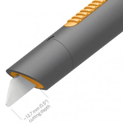 | Three-position manual pen cutter includes one replaceable Slice ceramic safety blade. Patented handle with rubberized slider button limits the amount of exposed ceramic-blade to further reduce injuries. Three positions including fully-retracted. Patented high-tech double-sided Slice ceramic blade designed to reduce injuries by incorporating a safer rounded-tip. Sharpness level up to 10x longer than steel. Measures 135 mm L x 18 mm diameter (5.3 in L x 0.75 in diameter). |