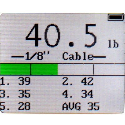 Display shows tension, battery charge level, cable diameter selected and user-stored tension values