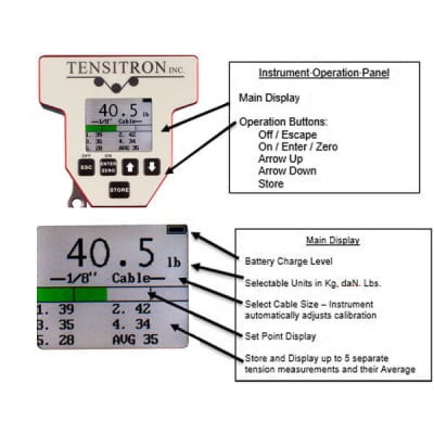 Display shows tension, battery charge level, cable diameter selected and user-stored tension values