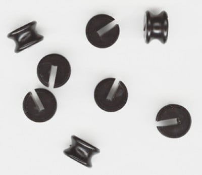 | Thimble Bushings are a precision molded nylon insert that helps elminate thimble elongation under load to maintain correct cable length and tension. They are used by many ultralight and hang glider manufacturers. They can be used with 1/16″, 3/32″ or 1/8″ cable. The slot depth corresponds to the hole edge distance in tang (measurement from edge of hole to edge of tang). Choose the size that most closely matches tang thickness and hole edge distance. Thimble is opened up to insert bushing and then closed. Color is black.